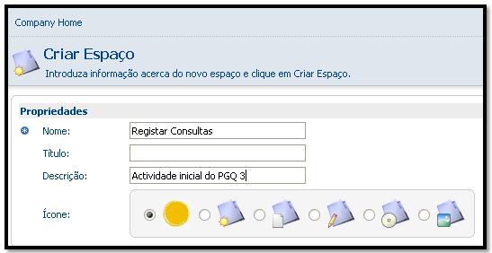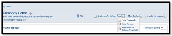 As pastas representam as actividades dos fluxogramas criados para cada Procedimento de Gestão da Qualidade e funcionam com o “veículo” para a circulação dos documentos ao longo do seu ciclo de vida. Através da definição de um conjunto de “regras”, o documento transita entre as várias actividades/pastas e colaboradores, desde o inicio do processo até à sua conclusão. No entanto, as pastas podem ser utilizadas apenas como repositórios de dados dependendo do uso que lhe queiramos atribuir. No Alfresco, para criar uma nova pasta, basta seleccionar a opção “Criar”, e em seguida, “Criar Espaço”.