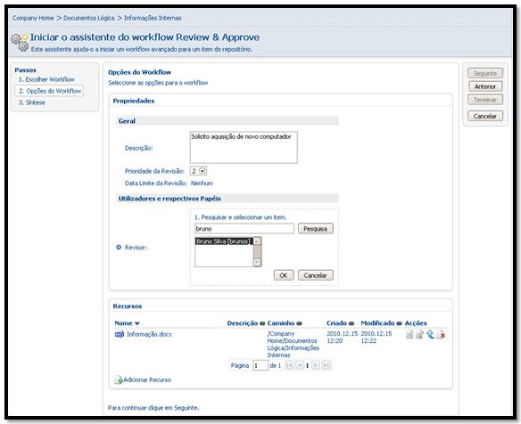 No assistente de Workflow Avançado é possível adicionar mais alguma informação ao próprio envio do documento, assim como definir o nome do colaborador receptor da informação.